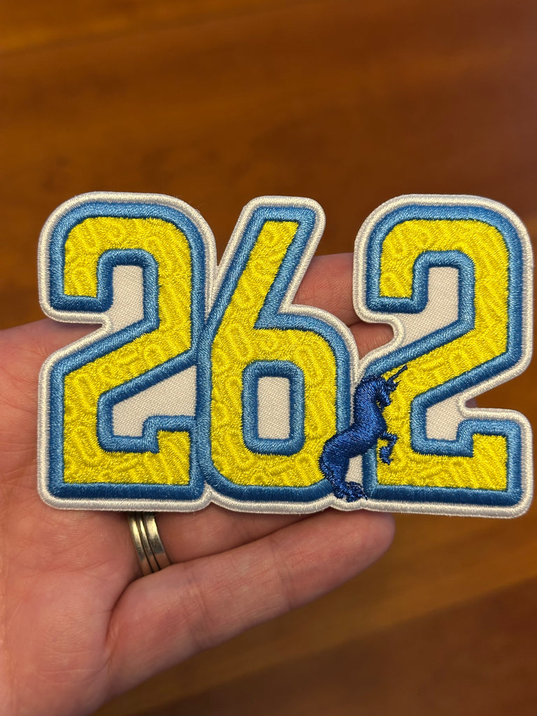 Run the distance, earn the patch. Celebrate your marathon finish (or motivate yourself to get there) with our Boston-Inspired "26.2" Marathon Milestone patch! This sleek yellow and blue embroidered design with threaded edges is not just a patch; it's a celebration of your endurance. Decorated with a metallic navy unicorn, this is a statement piece from start to finish.